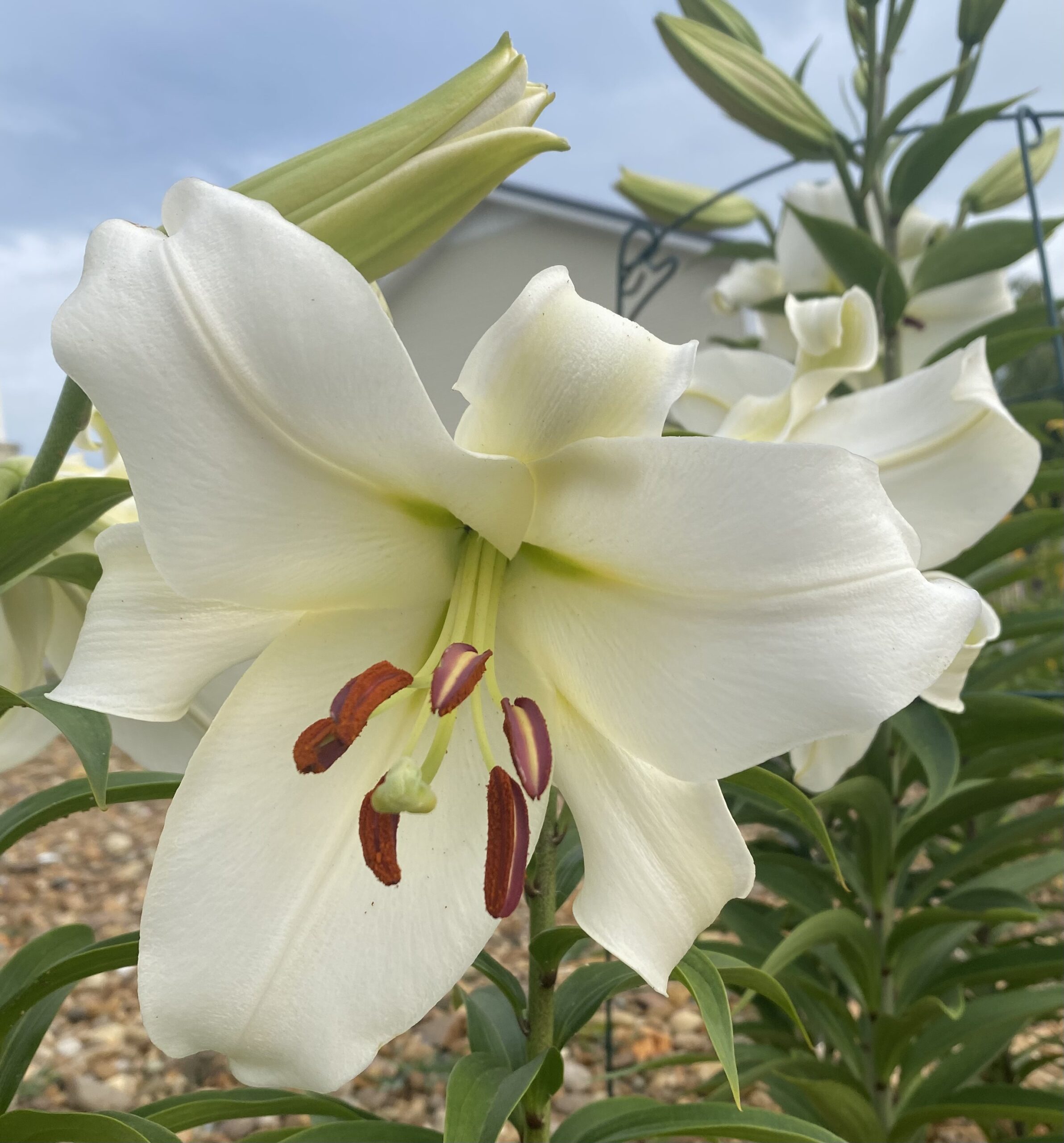 Big beautiful fragrant Casa Blanca Oriental Lily, 6-7″ blooms 5 ft ht. Will multiply over time. Great in cut flower collection.