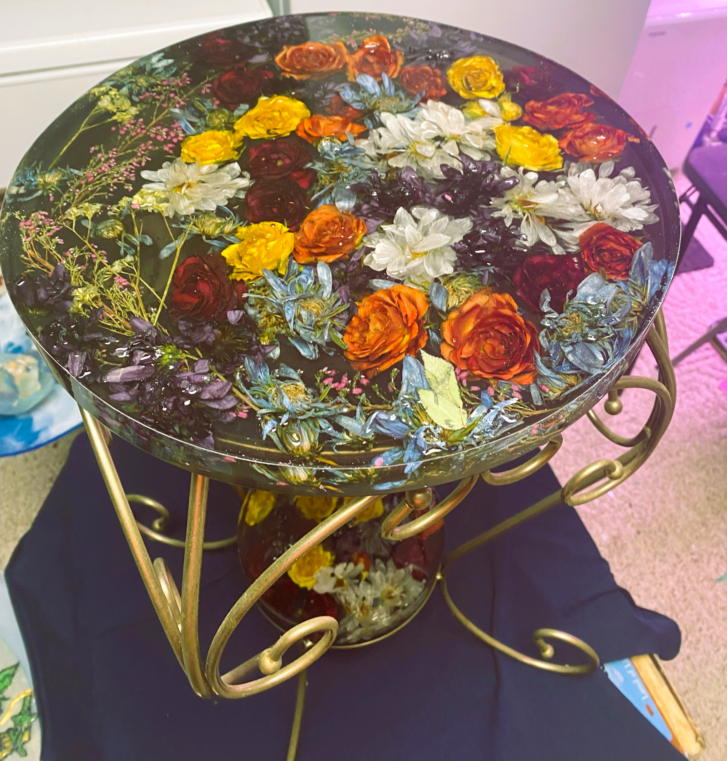 Handpoured floral resin art table made with flowers grown and dried on our farm. Two tier table tops on brass scroll work base. 20in circumfrence x 1.5inch thickness top and bottom tier is 8inch circumference x 1.5inch thickness.