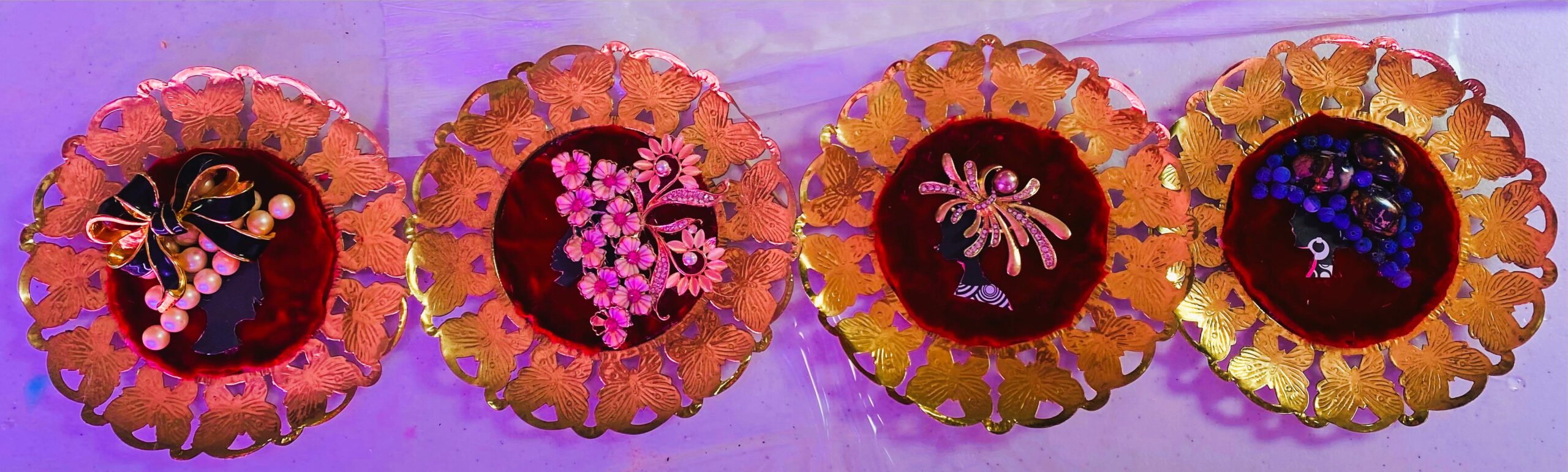 Set of 4 brooch art Ladies of the Derby in gold foil frames of butterflies (English). Vintage Brooches are used to depict the lovely hats of the Ladies of the Derby.