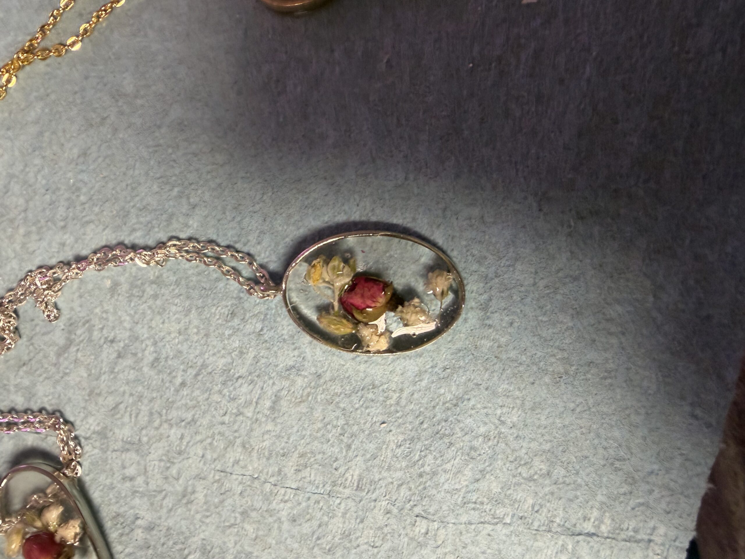 Silver chain and oval bezel with a rose bud and baby’s breath in resin base